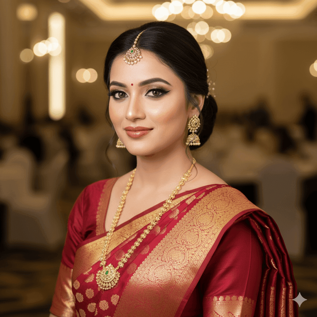 Varanasi ki shaam, banquet ki lighting, Banarasi outfits ka charm aur modern glam makeup ka mix — yeh sab milkar reception look ko truly unforgettable bana dete hain. A modern bride ke liye reception night ek perfect moment hota hai style aur personality ko confidently show karne ka, aur sahi makeup look is confidence ko double kar deta hai.
